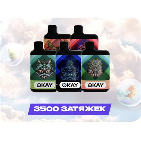Okay 3500 - 3500 затяжек Вкусы: Грейпфрут-клубника-виноград Маракуйя-лимон Папайя-груша-киви Брусника-клюква-виноград Тирамису-мёд Папайя-персик-дыня Огурец-алое-лайм Энергетик-мохито Розовый лимонад-лайм Персиковое мороженое